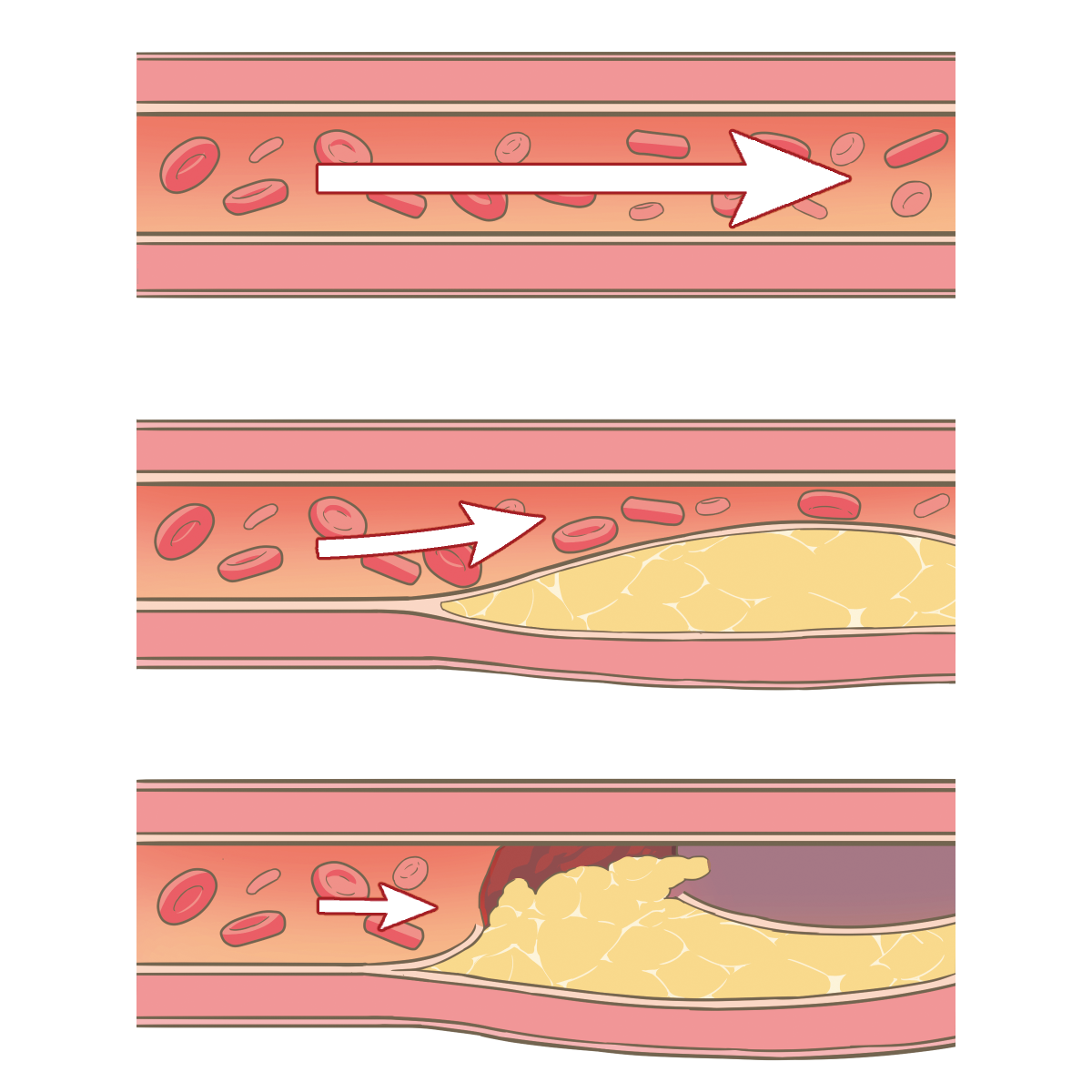 動脈硬化が進行すると脂質や石灰などからなるかたまりであるプラークが形成されます。プラークの成長に伴い血管の内腔は徐々に狭まり、労作性狭心症を生じるようになります。心筋梗塞はこのプラークが脆弱化し破裂することで、冠動脈内に血栓が形成され詰まってしまうために発症します。